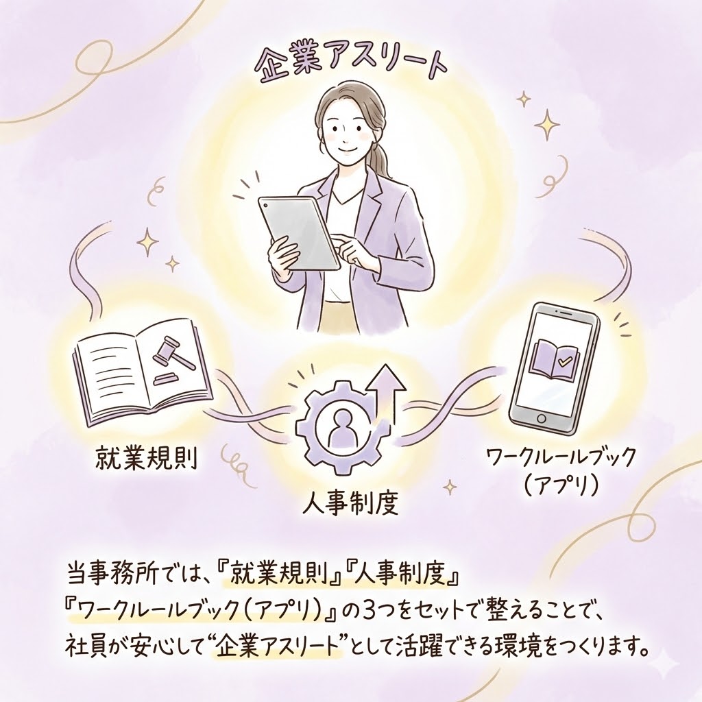 当事務所では、「就業規則」「人事制度」「ワークルールブック(アプリ)」の3つをセットで整えることで、社員が安心して“企業アスリート”として活躍できる環境をつくります。