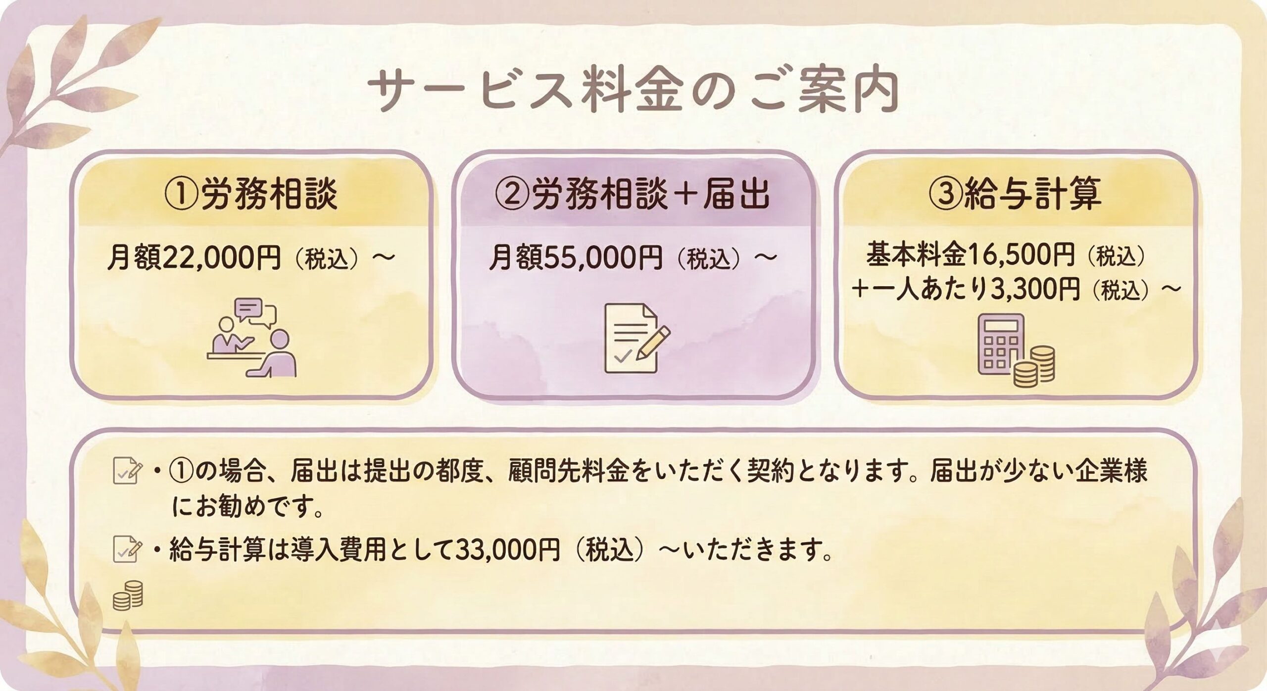 最低賃金の改定や社会保険料の変更、有給休暇の管理……。「本当に正しいのか?」と不安になりながら、調べ物に多くの時間を奪われていませんか? その「迷う時間」と「精神的な負担」を手放し、ぜひ本業に専念してください。