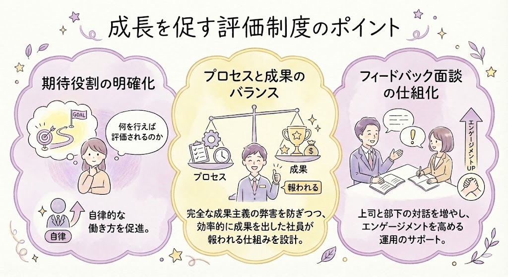 - プロセスと成果のバランス: 完全な成果主義の弊害を防ぎつつ、効率的に成果を出した社員が報われる仕組みを設計。