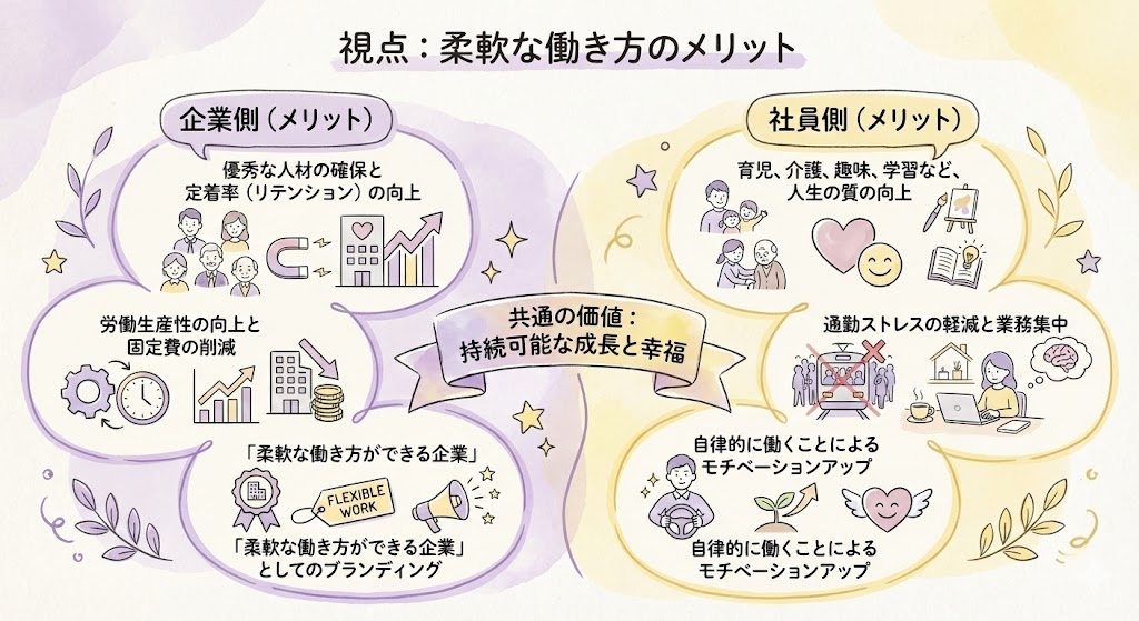 - 従業員満足度・エンゲージメントの向上: 会社が個人の多様なライフスタイルを尊重し、柔軟な働き方を認めることで、従業員のエンゲージメント(仕事への主体的な貢献意欲)が高まります。