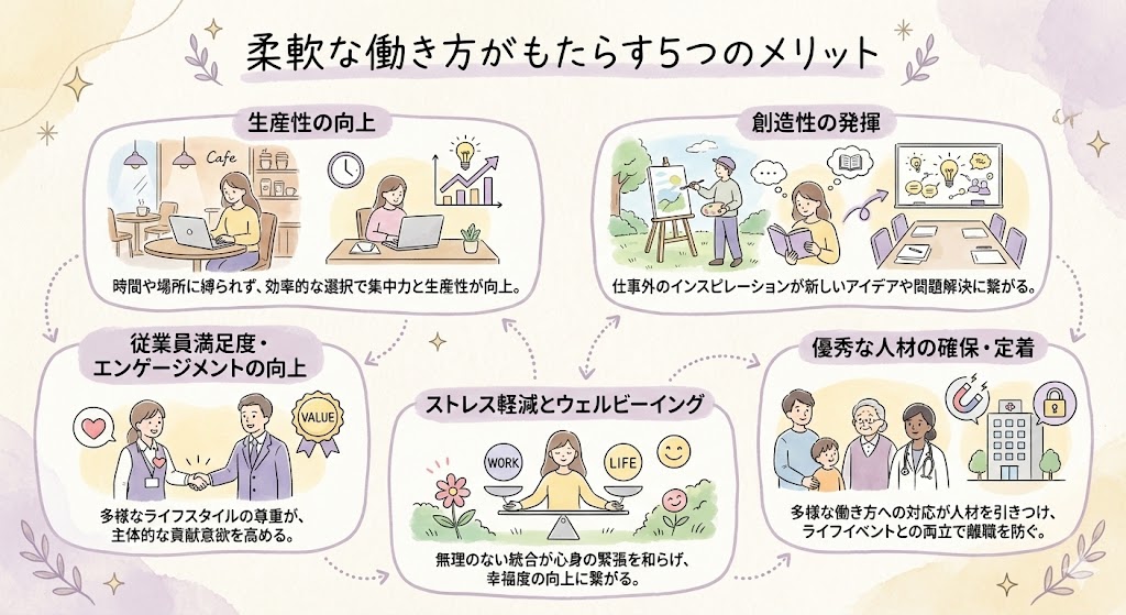 - ストレス軽減とウェルビーイング: 仕事と生活を無理に切り離そうとしないことで、心身の過度な緊張が和らぎ、ストレス軽減や全体的なウェルビーイング(幸福度)向上に繋がります。